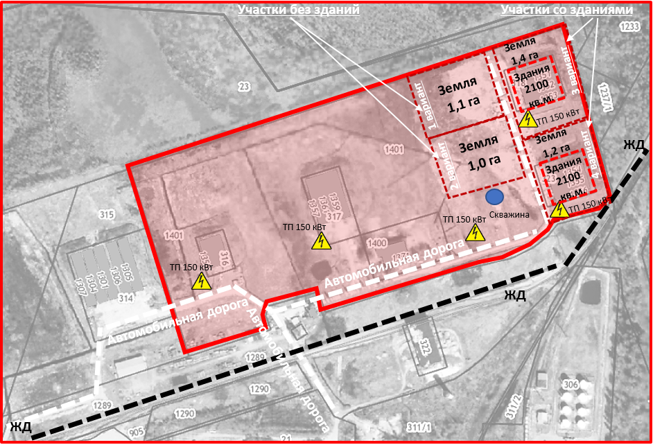 Земельные участки 1,2 и 1,4 га, со зданиями 2100 кв.м. производственно-складского назначения обеспечены выделенной электрической мощностью по 150 кВт (1 ТП на каждый из участков).